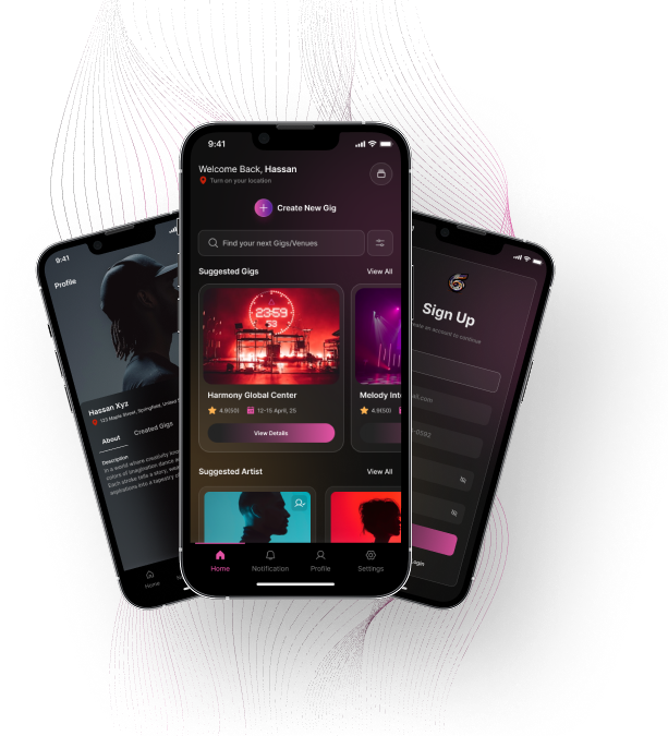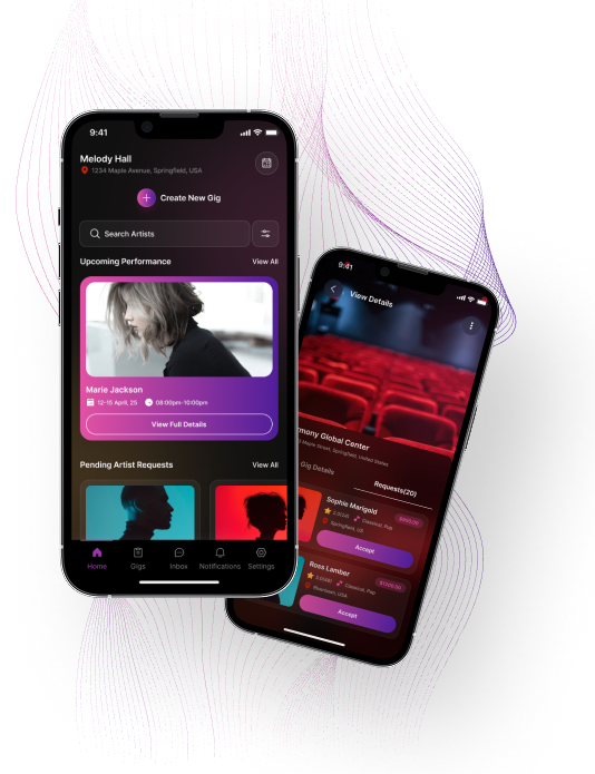 Artists explore venues and send gig requests. Venues post gigs, search talent, and invite artists. Fans browse upcoming shows or create private “Temp Gigs”.