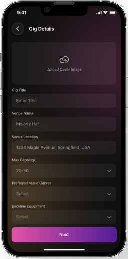 Set up your stage-ready persona: artists showcase their media gallery, genre, experience, and vibe-while venues highlight their space, capacity, gear, and proffered music style. Profiles help fuel perfect matches.