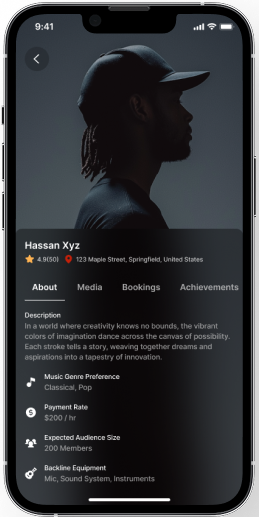 - Build your reputation with a personalized artist profile showcasing your music style, past gigs, fan reviews, and social media integration.